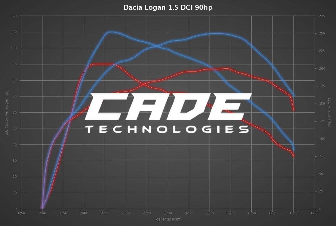 CADE TECHNOLOGIES is leading in the development of Dacia Logan 1.5 DCI 90hp tuning files. The development of each Dacia Logan 1.5 DCI 90hp tuning file is the result of perfection and dedication by CADE TECHNOLOGIES programmers. The organization only uses the latest technologies and has many years experience in ECU remapping software. Many (chiptuning) organizations around the globe download their tuning files for Dacia Logan 1.5 DCI 90hp at CADE TECHNOLOGIES for the best possible result. All Dacia Logan 1.5 DCI 90hp tuning files deliver the best possible performance and results within the safety margins.